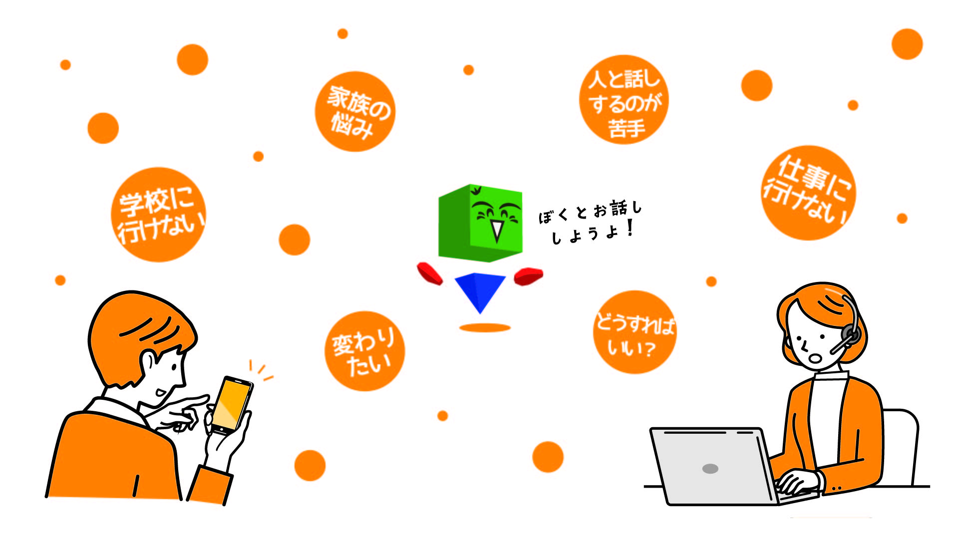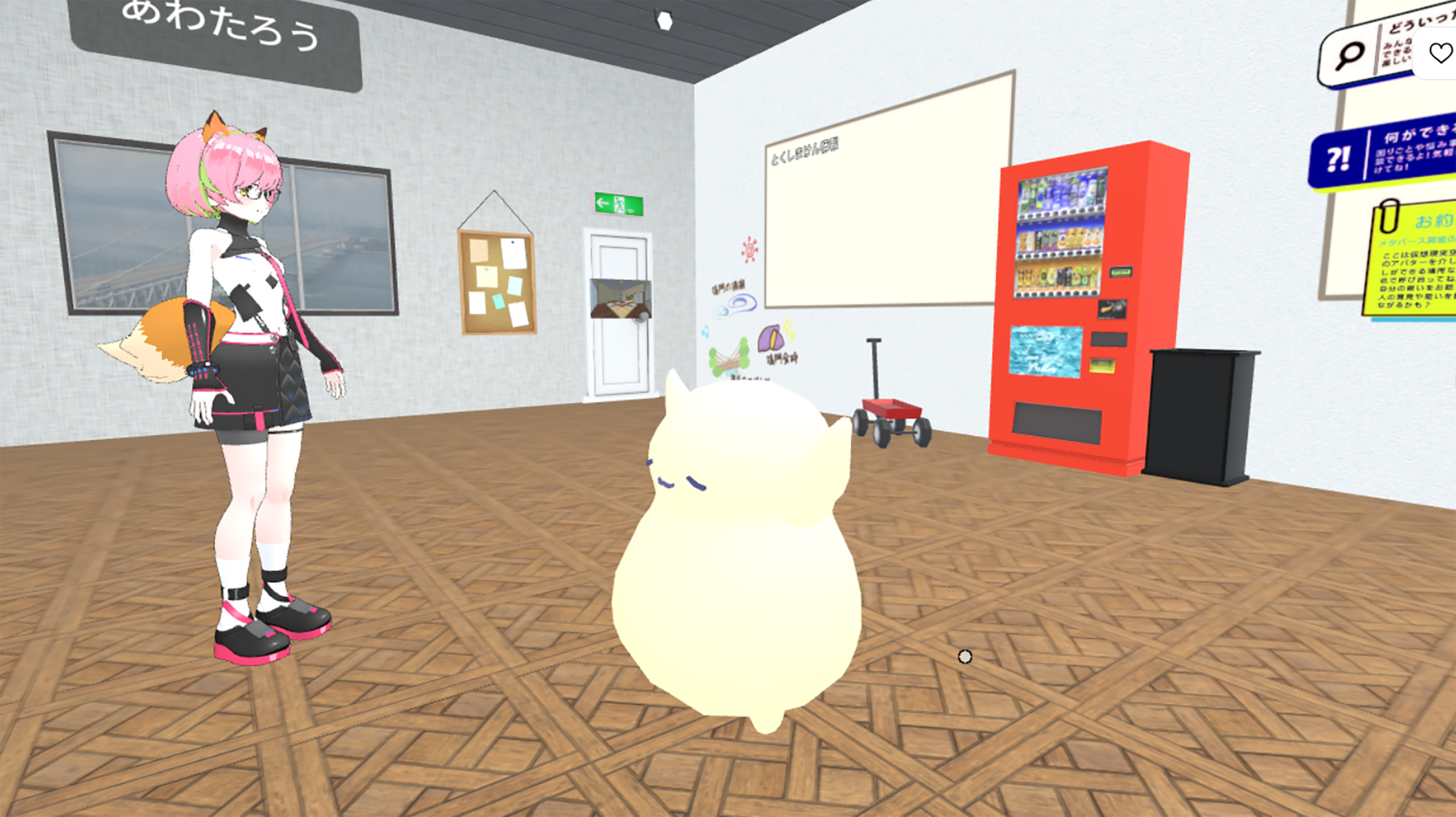 「メタバーすだちくん」と「ふくぴあ」が対応してくれるよ!大きな声でこんにちわ~★個別の相談がある場合はふくぴあに言ってね!別室へ案内してくれるよ!チャットでも対応します!