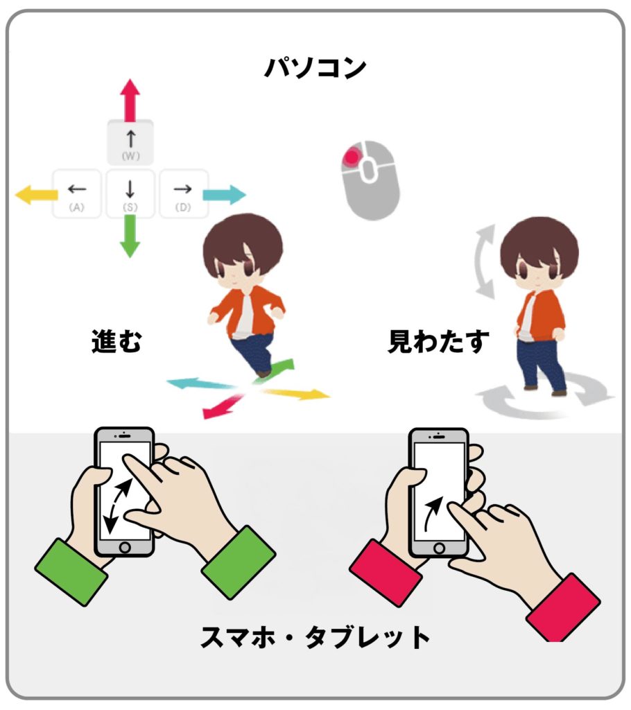 進む操作はスマホやタブレットは親指をアバターにトンと置いて、人差し指で行きたい方向へスクロールで進むよ。パソコンは前へ移動はW右へはD左はA後ろへはS。画面の向きはマウスの左クリックを押して動かしてね。ダンスや笑ったりのコマンドも使えるよ!操作中ブラウザバックしてしまうと退室してしまうので注意してね!
