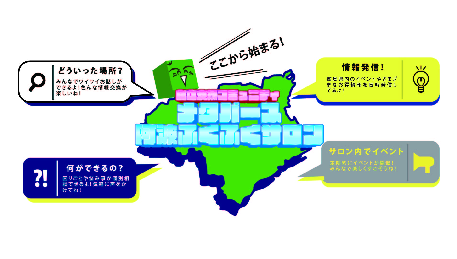 徳島県内のイベントやさまざまなお得情報を随時発信してるよ!サロンでは色んな人と交流ができます。積極的にお話ししてみよう!自分にはない視点が発見できるかも?!困りごとや悩み事が個別相談できるよ!専門機関への連携・相談も行っています。まずはサロンキャラクターふくぴあに声をかけてみよう。