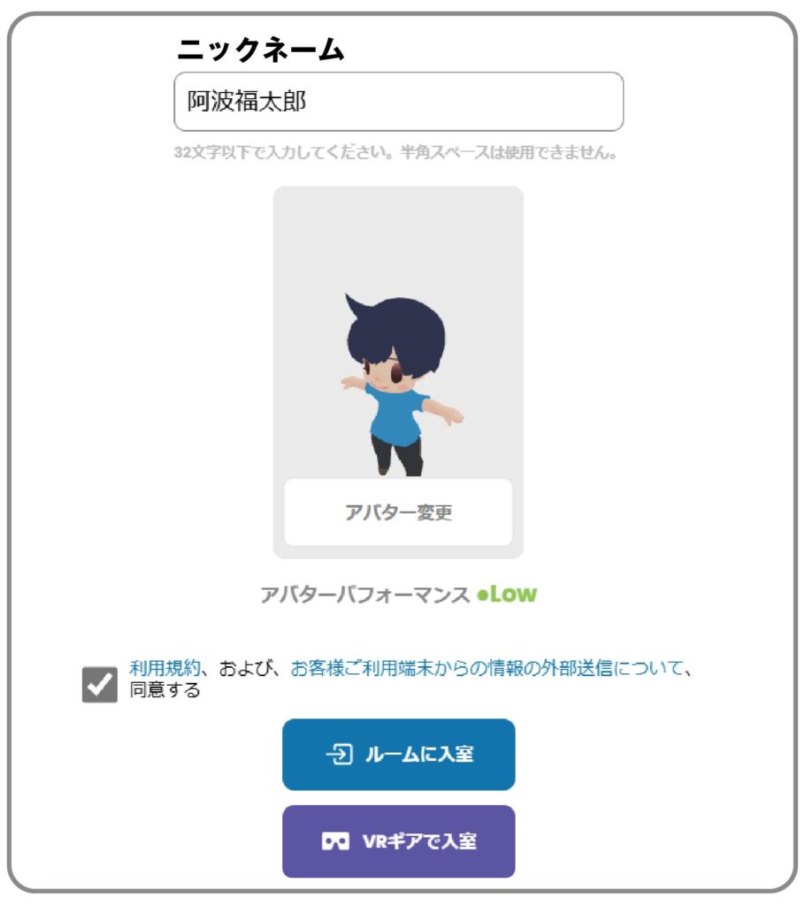 アクセスをしたら、サロン内で呼び合うニックネームを決めて、好きなアバターを選択しよう。音声テストも確認してね。声を出せない、出したくない場合はチャットでも大丈夫!